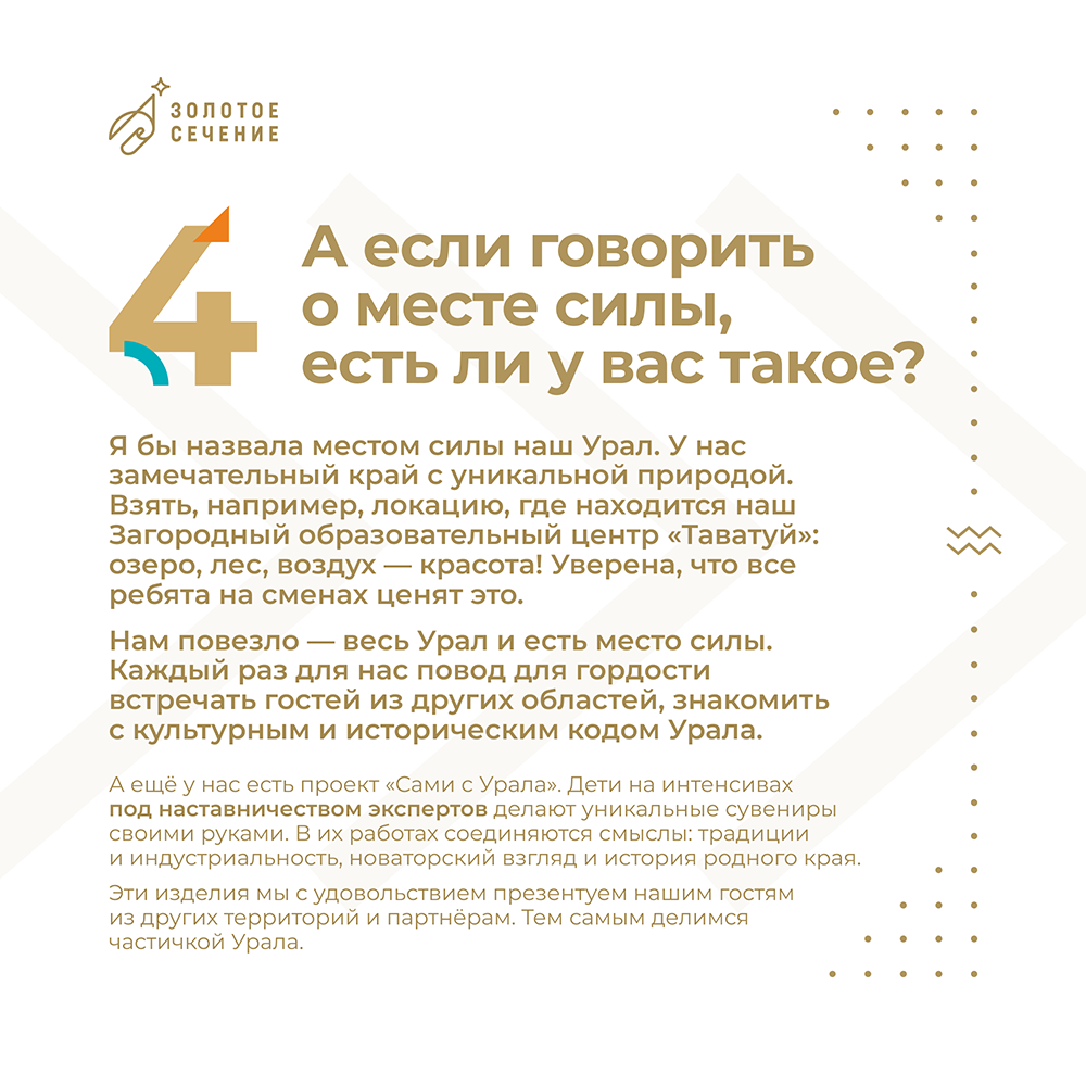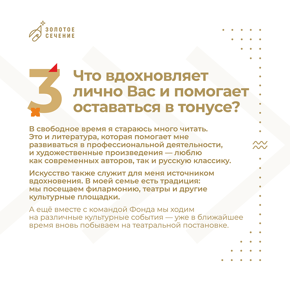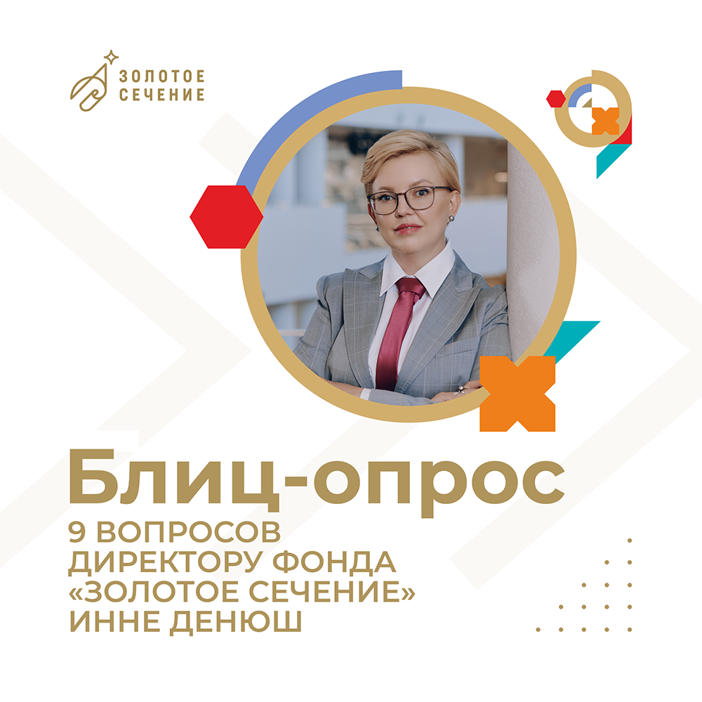 Инна Казимировна Денюш, директор Фонда «Золотое сечение» ответила на 9 вопросов о работе регионального центра, поделилась личным и дала напутствия нашим обучающимся.
