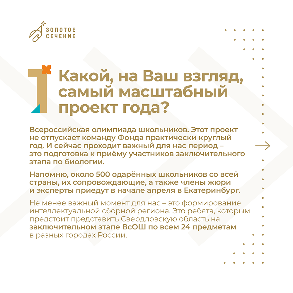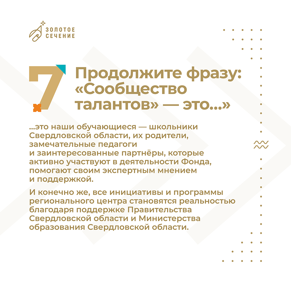 2 марта 2017 года по указу Губернатора Свердловской области был основан региональный центр поддержки одаренных детей и молодежи Фонд «Золотое сечение». Миссией Фонда является создание условий для раскрытия таланта, способностей каждого ребенка. Мы аккумулируем ресурсы, привлекаем партнеров, действуем при поддержке Правительства Свердловской области и Министерства образования Свердловской области, собираем сообщество увлеченных и заинтересованных.